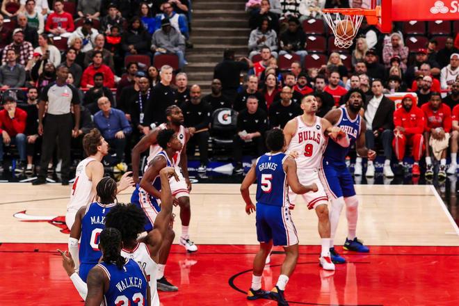 首节还剩下4分多钟的时候,公牛队落后了11分。倒也不是他们打得很差,而是76人进攻端状态有些太好了。7分半钟的时间,公牛队得到了20分,不算很差。而76人则砍下了31分,首节打完,他们得到了45分,确实是夸张。而且,出色的进攻效率还延续到了次节,76人官方甚至都在社交媒体上发文:“没忍住笑出声了,不敢想这竟然是我们现在的生活!”不过下半场,公牛队展现了他们东部第一的势头。在76人开局勇猛的情况下,第三节结束的时候,公牛队还是保持着11分的分差,没有让76人一波流带走。而且末节,公牛队成功限制76人接近半节时间不得分(76人自身手感也很差),而公牛队则是趁机疯狂追分。