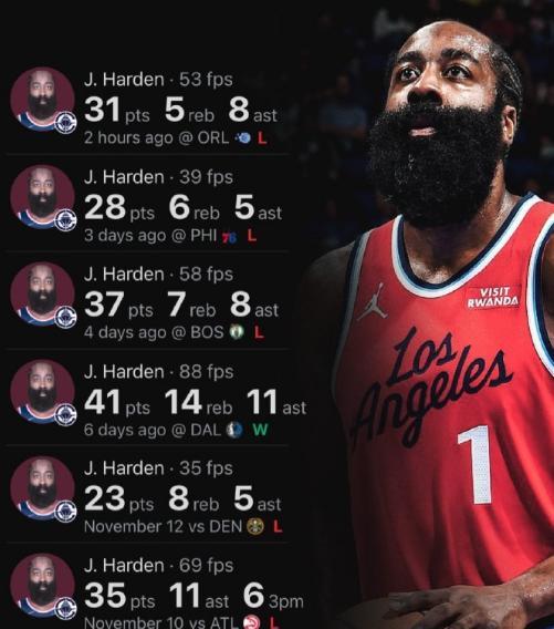 而过去六场比赛,哈登场均32.5分8.0助攻8.3篮板,快船1胜5负,赛季至今快船4胜11负!